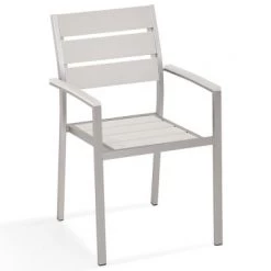 Chaise de jardin moderne blanche et argentée. Cette chaise de couleur blanche saura vous convaincre par son design classique et élégant. Avec cette chaise vous pourrez créer sur votre terrasse un espace déjeuner convivial, confortable et très moderne. Le bois synthétique de haute qualité et l’aluminium, utilisés pour cette série de meubles, sont des matières résistantes et durables et peuvent être entièrement recyclées. *Veuillez noter qu’en plein soleil, le verre ne doit pas entrer en contact direct avec la surface de cette chaise. Détails: Type de produit: Chaise de jardin Style: Industriel Couleur principale: Blanc Type de matière: Plastique Matière principale: Bois synthétique Matière secondaire: Aluminium Matière de l`assise: Plastique Accoudoirs: Oui Finition: Revêtu de poudre Pliable: Non Empilable: Oui