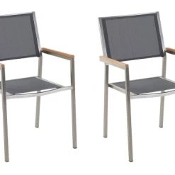 Lot de 2 chaises de jardin en acier inox et textile. Les chaises grises au design moderne vous apporteront un espace idéal pour votre jardin, patio ou bords de piscine. Les accoudoirs synthétiques permettent un confort parfait. Construites en acier inoxydable résistant aux intempéries, elles vous serviront pendant de longues années. Détails: Type de produit: Chaise de salle à manger Style: Moderne Couleur principale: Gris Type de matière: Métal Matière principale: Polyester Matière secondaire: Bois synthétique Composition de la matière: 90% PVC Accoudoirs: Oui Finition: Brossé Pliable: Non Empilable: Oui