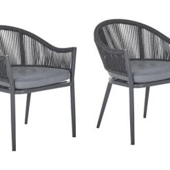 2 fauteuils de jardin en aluminium avec dossiers en corde tressée. Élégantes et spacieuses, ces chaises de jardin sont un complément parfait à tout extérieur contemporain, traditionnel ou rétro. Fabriquées à partir d’aluminum robuste de couleur grise, elles charment avec leurs dossiers en corde tressée. Résistants aux variations de température et aux rayons UV, ces fauteuils offrent un confort d’assise optimal. Les galettes de sièges font partie de l’offre. Détails: Type de produit: Chaise de jardin Style: Moderne Couleur principale: Gris Nuance: Gris foncé Type de matière: Métal Matière principale: Aluminium Matière secondaire: Polyester Matière du piétement: Métal Matière de l`assise: Tissu Composition de la matière: 100% Polyester Accoudoirs: Oui Finition: Revêtu de poudre Pliable: Non Empilable: Non