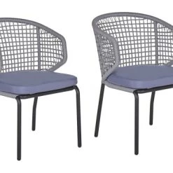 2 fauteuils de jardin en aluminium noir avec dossiers gris . 2 chaises de jardin confortables et originales qui sauront se faire apprécier. Leur dossiers arrondis sont en corde tressée, tandis que leur structure est en aluminum noir robuste. Les coussins d’assise généreusement rembourrés, inclus dans l’offre, garantissent le plus grand confort. Les chaises se marient parfaitement aux styles contemporain, moderne ou traditionnel. Vous pouvez les compléter, en ajoutant une table et créer ainsi un ensemble parfait pour dîner sur votre balcon, terrasse ou dans votre jardin. Détails: Type de produit: Chaise de jardin Style: Moderne Couleur principale: Gris Type de matière: Métal Matière principale: Aluminium Matière secondaire: Polyester Matière du piétement: Métal Matière de l`assise: Tissu Composition de la matière: 100% Polyester Accoudoirs: Oui Finition: Revêtu de poudre Pliable: Non Empilable: Non
