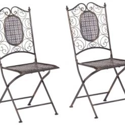 Sièges d’extérieur. Profitez d’une ambiance romantique sur votre balcon ou terrasse avec cet ensemble de deux chaises pliables d’inspiration vintage. Grâce à une fabrication en acier, un design ajouré et une finition vieillie, l’ensemble s’adapte facilement à tous types de configurations et vous servira pour de nombreuses années à venir.Détails: Type de produit: Chaise de jardin Style: Rétro Couleur principale: Noir Type de matière: Métal Matière principale: Acier Matière du piétement: Métal Matière de l`assise: Métal Accoudoirs: Non Finition: Revêtu de poudre Pliable: Oui Empilable: Non Dimensions: Profondeur: 60 cm Hauteur du siège: 43 cm Largeur: 40 cm Hauteur: 93 cm Surface d`assise: 38×35 cm Poids: 5 kg Charge admise: 120 kg L`offre inclue: 2 x Chaise Caractéristiques clés: Style rétro, UV Résistance, Approprié pour un usage extérieur, Pliant et facile à ranger, Design compact, idéal pour des espaces limités, Pieds antidérapants Informations d`assemblage: Ne nécessite pas d’assemblage Informations supplémentaires: Attention ! Ne pas ouvrir l’emballage avec un objet pointu ou coupant qui risquerait d’endommager le produit., L’effet d’usure, l’aspect vieilli ou taché de ce produit sont intentionnels et ne peuvent pas être considérés comme défauts de fabrication. Texte sur la résistance: La résistance légère à l’eau vous permet d’utiliser librement l’article à l’extérieur et de le garder à l’extérieur pendant les pluies légères et dans des conditions humides. Cependant, il doit être conservé à l’intérieur lorsqu’il n’est pas utilisé. L’exposition à long terme du meuble à l’humidité peut l’endommager. Résistance: Humidité Conseils de maintenance: