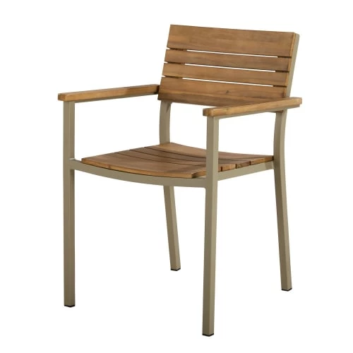 Profitez de vos repas à l’extérieur en alliant confort et style avec la chaise de jardin SALVIA ! En acacia massif effet teck et aluminium vert kaki, elle est parfaitement en accord avec la nature et sera un vrai atout de charme à votre extérieur. Avec ses accoudoirs, elle vous permettra d’être toujours bien installé. Idéal pour vous détendre, ce fauteuil est empilable pour vous permettre un gain de place lors de son rangement. Pour un ensemble tout en harmonie, n’hésitez pas à associer cette chaise avec accoudoirs à la table SALVIA assortie !