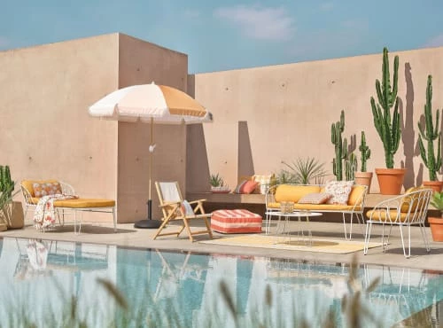 Revêtement coussin : 100% polyester, coloris ocre, résistant à l’eau et aux UV, déhoussable