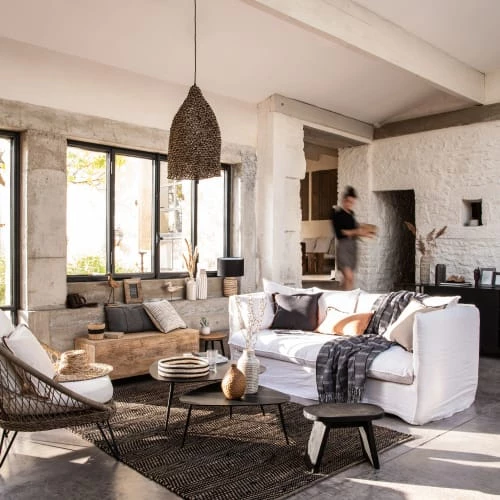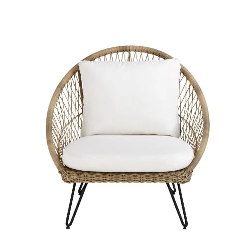 On aime quand le style vintage se prête au mobilier d’extérieur, à l’image du fauteuil de jardin en résine tressée PINEAPPLE ! Son revêtement imite à merveille le rotin et le revisite de manière moderne, subtilement associé à un piètement en acier noir finition époxy. Pour encore plus de confort, vous pourrez compter sur ses coussins moelleux en tissu écru et son assise enveloppante. Cerise sur le gâteau ? Les coussins déhoussables, parfaits pour un entretien facilité !